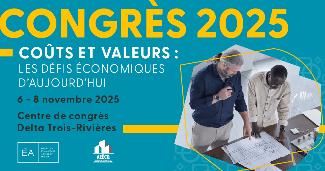 Participez au congrès conjoint de l’Ordre des évaluateurs agréés du Québec (OEAQ) et de l’Association des estimateurs et des économistes de la construction du Québec (AEÉCQ), qui se tiendra sous le thème Coûts et Valeur : Les Défis Économiques d’Aujourd’hui.