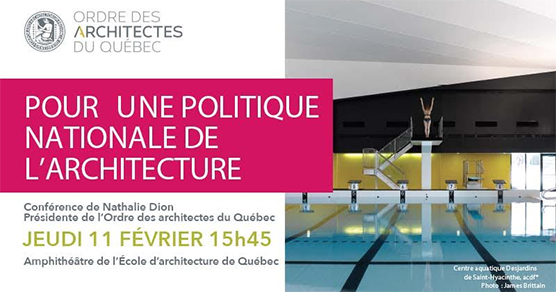 Conférence de Nathalie Dion, présidente de l’Ordre des architectes du Québec sur la création d’une politique nationale de l’architecture qui permettrait au Québec de marquer un virage en matière de qualité des constructions.