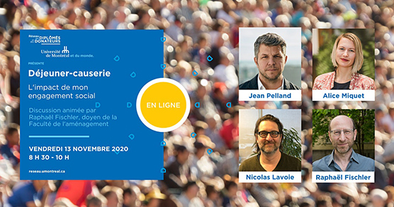 Le Réseau des diplômés et des donateurs de l’Université de Montréal en collaboration avec la Faculté de l’aménagement présente le déjeuner-causerie « L’impact de mon engagement social » le vendredi 13 novembre 2020 à 8 h 30.