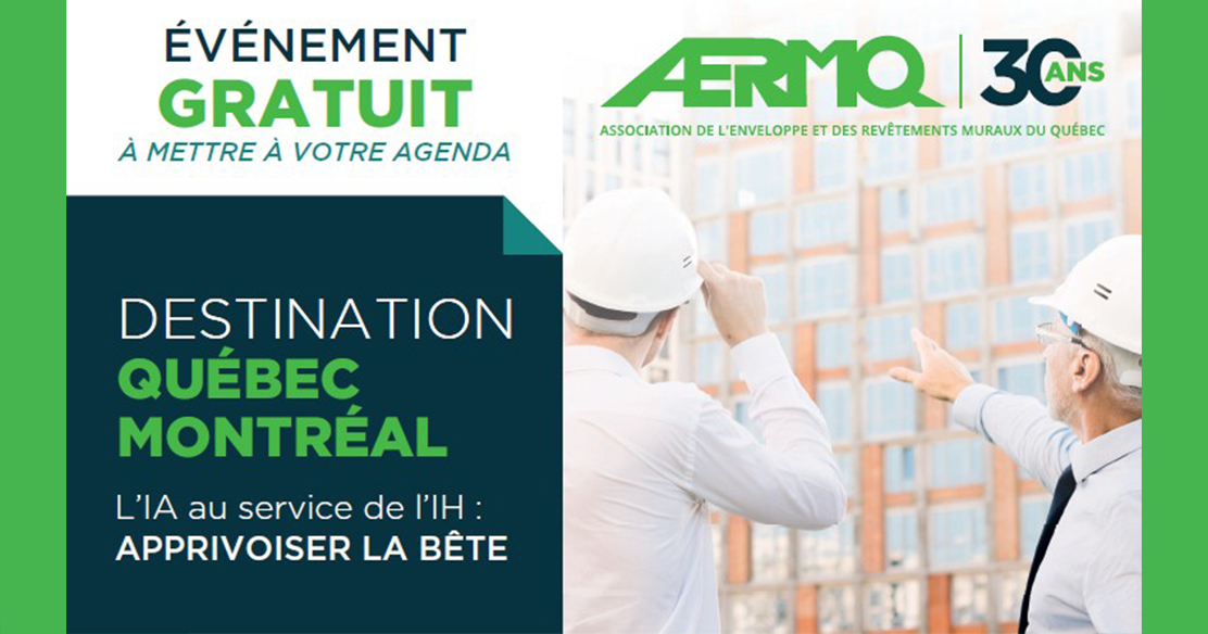 « L’Association de l’enveloppe et des revêtements muraux du Québec (AERMQ) vous invite à deux journées de formation essentielles pour découvrir comment l’intelligence artificielle peut transformer votre pratique professionnelle dans le domaine de l’enveloppe du bâtiment.