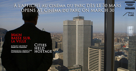« Main basse sur la ville, un documentaire écrit et réalisé par Martin Frigon, produit par Catherine Drolet présenté devant une salle comble, en première aux Rendez-vous Québec Cinéma prend maintenant l’affiche au Cinéma du Parc, dès le 30 mars en version originale avec sous-titres français ou anglais, selon les séances.