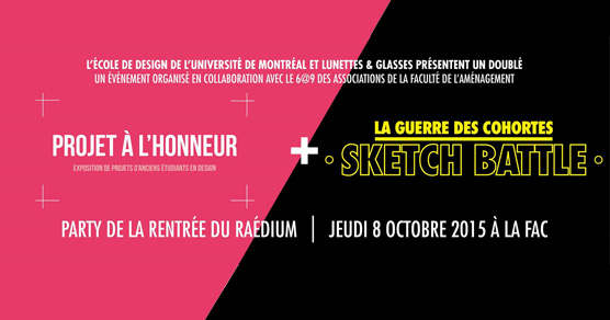 Cette soirée marquera aussi le GRAND retour de la Guerre des Cohortes amorcée en 2009 par le RAÉDIUM lors du 40ème anniversaire de l’École de Design de l’UdeM. Cette fois, les cohortes sont invitées à s’affronter dans le cadre d’un fracassant “SKETCH BATTLE” qui met à profit la créativité des concurrents par l’intermédiaire de scénarios inspirés des ligues d’impro. Vous avez la double occasion d’assister à cette épreuve à titre de concurrent ou d’observateur, ainsi que de célébrer la rentrée aux côtés de vos pairs designers. Sortez vos marqueurs, vos stylos à bille, vos verithins bleu indigo et votre vieux pad de papier letraset pour une bonne vieille session de sketchs avec ou sans vignettes !