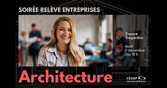 « C’est avec un grand plaisir que les membres du département de Technologie de l’architecture du Cégep Saint-Jean-sur-Richelieu vous convient à la « Soirée relève entreprise en architecture », jeudi 2 décembre 2021, 18h00, à l’Espace Desjardins du Théâtre des Deux-Rives. Cet évènement vous permettra de rencontrer les finissants du programme et de visualiser leurs portfolios.