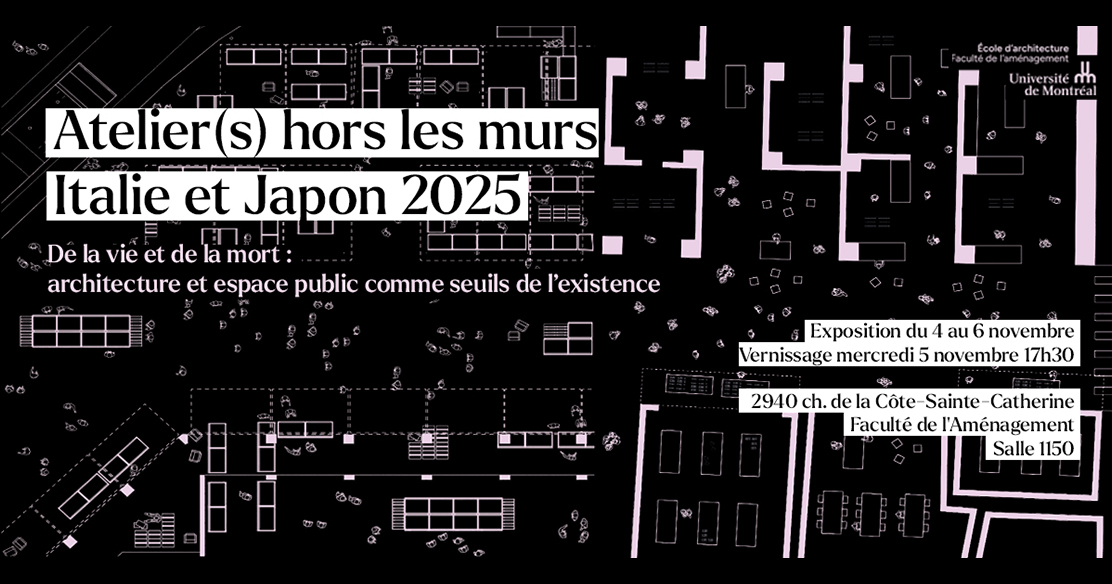 Nous avons le plaisir de vous inviter à l’exposition de l’Atelier Hors les Murs 2025 qui s’est déroulée en Italie et au Japon sous la responsabilité de la professeure Alice Covatta, avec les enseignants, Giovanni Corbellini, professuer titulaire du Politecnico di Torino, et Guillaume Pelletier, architecte et chargé de formation pratique de l’École d’Architecture, Université de Montréal.