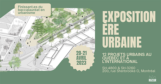 « L’Association générale étudiante en urbanisme de l’ESG-UQAM (AGEUR) vous invite à l’exposition Ère Urbaine afin d’assister aux présentations des projets terminaux des finissant.es du baccalauréat en urbanisme de l’UQAM les 20 et 21 avril prochains. Il s’agit d’un événement grand public visant à rassembler étudiant.es, professionnel.les, corps professoral, familles et ami.es.