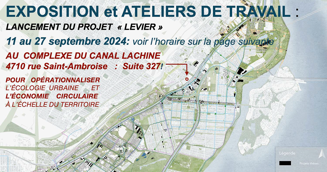 « Il nous fait plaisir de vous inviter à l’exposition du projet LEVIER réalisé en collaboration avec l’UQAM et l’ÉTS qui aura lieu au Complexe du Canal Lachine, 4710 rue Saint-Ambroise, suite 327, du 20 au 27 septembre prochains (voir horaire d’ouverture ci-dessous).