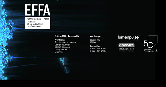 « Montréal, le 19 avril 2018 – Du 3 au 5 mai, la Faculté de l’aménagement de l’Université de Montréal présente l’exposition annuelle de ses finissants. Quelque 300 étudiants exposeront leurs projets dans les disciplines que regroupe la faculté, soit l’architecture, l’architecture de paysage, le design industriel, le design d’intérieur, le design de jeux et l’urbanisme.