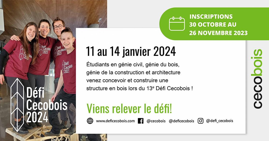 Qu’est-ce que le Défi Cecobois plus précisément ? Les étudiants devront concevoir en équipe une structure répondant à certains critères (design, intégrité structurelle, originalité, entre autres) en utilisant uniquement le bois. Afin de reproduire au mieux les conditions du marché professionnel, aucun participant ne connaîtra ni le thème, ni ses coéquipiers avant le premier jour de l’évènement.