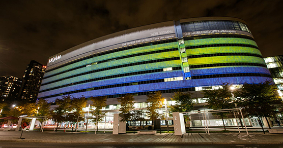 « Le 22 octobre 2015 – Du 22 octobre au 8 novembre 2015, la façade du pavillon Président-Kennedy (PK) de l’UQAM se transformera en gigantesque réflecteur d’ondes radio. La vidéoprojection architecturale Irradier représentera sur l’édifice les fréquences électromagnétiques captées sur la promenade des Artistes dans le Quartier des spectacles, à l’aide du vent. À mi-chemin entre l’art et la science, le projet illustre la densification des signaux numériques en milieu urbain, où se côtoient ondes, pollution et mouvements de l’air. La vidéoprojection est présentée du jeudi au dimanche, dès le coucher du soleil.
