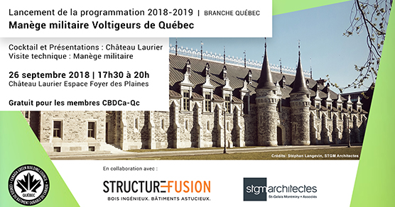 « La Branche de Québec du CBDCa-Qc a le plaisir de vous inviter au lancement de sa programmation annuelle 2018-2019 qui aura lieu au Château Laurier (Espace Foyer des Plaines), le 26 septembre prochain. En plus de découvrir nos nouvelles activités, conférences et formations, les personnes présentes auront la chance de visiter le nouveau Manège militaire Voltigeurs de Québec. Avant de faire la visite technique, les professionnels ayant contribué au projet exposerons les défis auxquels ils ont dû faire face lors de la conception et de la reconstruction de ce bâtiment aux qualités architecturales et patrimoniales uniques.