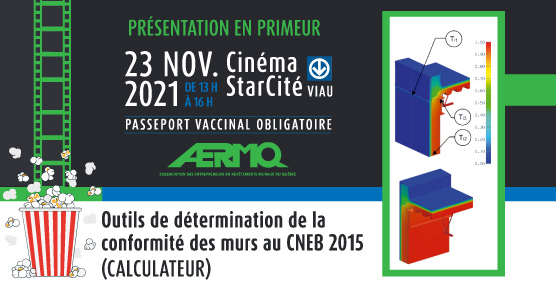 Pour faire suite à l’annonce précédente, l’AERMQ en collaboration avec le Conseil de l’enveloppe du bâtiment du Québec (CEBQ), vous invitent au lancement d’un calculateur avec la conformité des murs au CNEB 2015 et étude de cas dans une ambiance cinéma.