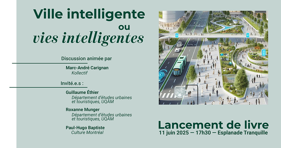 « Joignez-vous à nous le mercredi 11 juin à 17h pour célébrer le dévoilement du livre Ville intelligente ou vies intelligente, en présence des invités Roxanne Munger, Guillaume Ethier et Paul-Hugo Baptiste qui ont accepté de partager leurs impressions de lecteur et lectrice sous l’égide de Marc-André Carignan, chef de contenu mutliplateforme chez Kollectif.