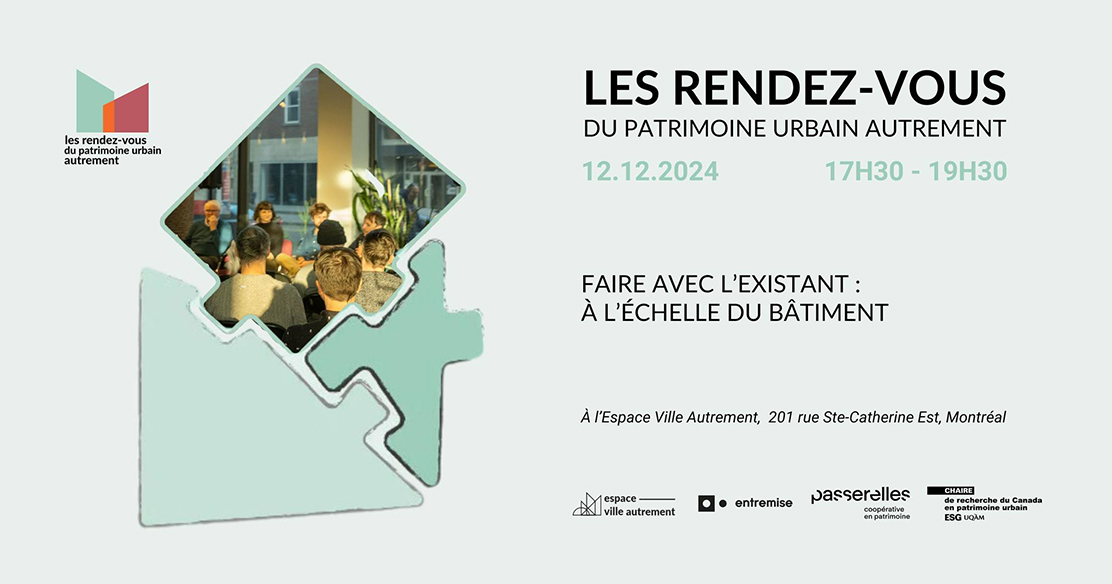« Espace Ville Autrement, Passerelles, Entremise et la Chaire de recherche du Canada en patrimoine urbain ont le plaisir de vous convier au second événement de la saison 2024-2025 des rendez-vous du patrimoine urbain autrement. Cette édition mettra en lumière le thème annuel « Faire avec l’existant » en s’attardant, cette fois-ci, à l’échelle du bâtiment. Plus de détails bientôt.