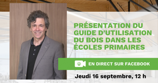 « Ajouter une alerte à votre calendrier : le jeudi 16 septembre à midi, notre collègue Benoit Béland, architecte, présentera en direct sur Facebook notre plus récent guide sur l’utilisation du bois dans les écoles primaires.