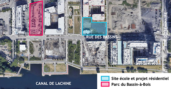 Ce projet mixte, développé par Bâtir son quartier, prévoit une école publique de niveaux préscolaire et primaire pour 2023. L’école comprendrait une cour donnant sur le parc du Bassin-à-Gravier, une aire de jeux sur le toit du gymnase et un débarcadère.