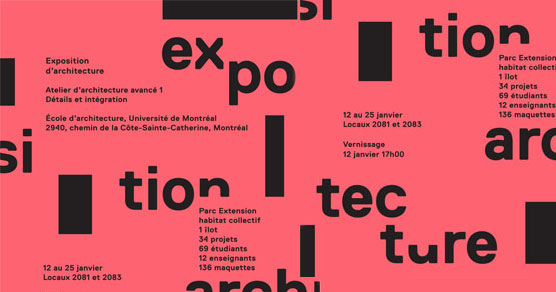 Vous êtes cordialement invités au vernissage de l’exposition regroupant les travaux des étudiants de l’atelier d’architecture avancé 1 (ARC6812) et du cours Détails et intégration (ARC6844) de l’automne 2014.