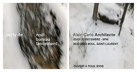 Bonne nouvelle, c’est maintenant au tour des équipes d’Alain Carle et de Nathalie Thibodeau d’inviter la communauté architecturale de Montréal à leur atelier commun le jeudi 22 décembre à partir de 21h :