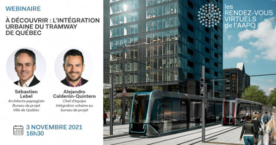 Pour en discuter, l’AAPQ invite Sébastien Lebel, membre du C.A. de l’AAPQ, architecte paysagiste et Alejandro Calderon-Quintero, chef d’équipe à l’intégration urbaine, tous deux membres du Bureau de projet du tramway de Québec.