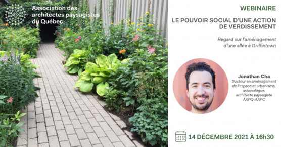 « Le webinaire fera une incursion au cœur de l’effervescent quartier urbain de Griffintown à Montréal, un secteur de la ville reconnu davantage pour son développement immobilier que pour ses espaces verts. Entre les tours résidentielles, un droit de passage a graduellement été transformé en une étonnante oasis verte.