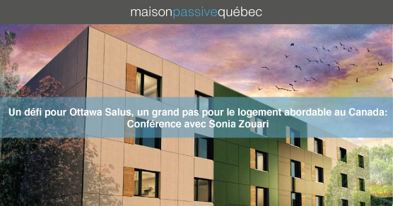 « Montréal, le 8 septembre 2016 – L’organisme Maison passive Québec, dont la mission est de promouvoir la norme «Passivhaus», invite Sonia Zouari, architecte chef de projet / conceptrice Maison passive (A/CSV Arch.) et Lisa Ker, Directrice d’Ottawa Salus à présenter la conférence «Un défi pour Ottawa Salus, un grand pas pour le logement abordable au Canada» le 11 octobre prochain à Montréal.