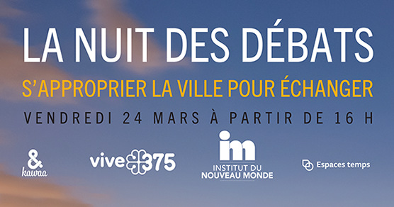 « La Nuit des débats est un événement invitant les citoyens à sortir et se rencontrer dans des lieux publics, le temps d’une soirée, afin de discuter, d’échanger et de débattre. Montréal, tout comme Dakar, rejoint Paris cette année dans un événement sans précédent où des milliers de citoyennes et de citoyens pourront échanger avec d’autres dans des centaines de lieux à travers la ville sur les sujets qui leur tiennent à cœur. Organisé par l’Institut du Nouveau Monde en collaboration avec la Ville de Montréal, et avec l’appui d’Espaces Temps et Kawaa, la Nuit des débats 2017 aura lieu le 24 mars et s’inscrit dans le cadre des célébrations du 375e anniversaire de la ville. Tous les Montréalais sont invités cette nuit-là à investir cafés, espaces publics, lieux d’échange et lieux de vie pour se rencontrer et échanger.