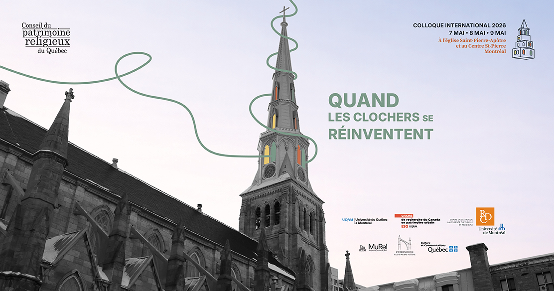 « Le Conseil du patrimoine religieux du Québec est heureux de vous annoncer la tenue d’un colloque international sur l’avenir du patrimoine religieux bâti. Intitulé Quand les clochers se réinventent, l’événement est organisé aux côtés de la Chaire de recherche du Canada en patrimoine urbain de l’École des sciences de la gestion de l’Université du Québec à Montréal et de la Chaire Diversité culturelle et religieuse de l’Institut d’études religieuses de la Faculté des arts et des sciences de l’Université de Montréal.