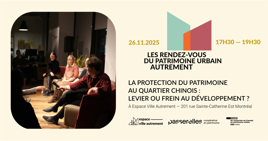 Espace Ville Autrement, Passerelles et la Chaire de recherche du Canada en patrimoine urbain ont le plaisir de vous convier au prochain Rendez-vous du patrimoine urbain autrement qui portera sur le Quartier chinois.