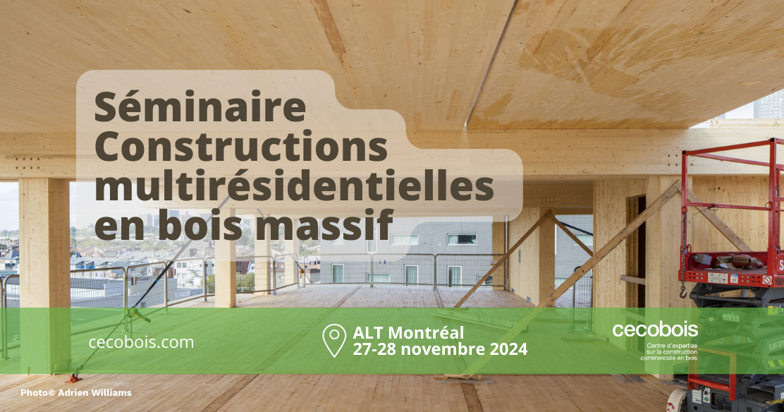 « Le Programme d’innovation en construction bois (PICB) suscitent encore quelques questionnements dans votre entreprise? Vous souhaitez réaliser des constructions multiétages en bois de optimales et efficaces ? Ne manquez surtout pas notre nouveau séminaire permettant d’explorer les possibilités offertes par le bois massif dans le domaine de la construction multirésidentielle les 27 et 28 novembre prochains, à l’Hôtel ALT de Montréal.