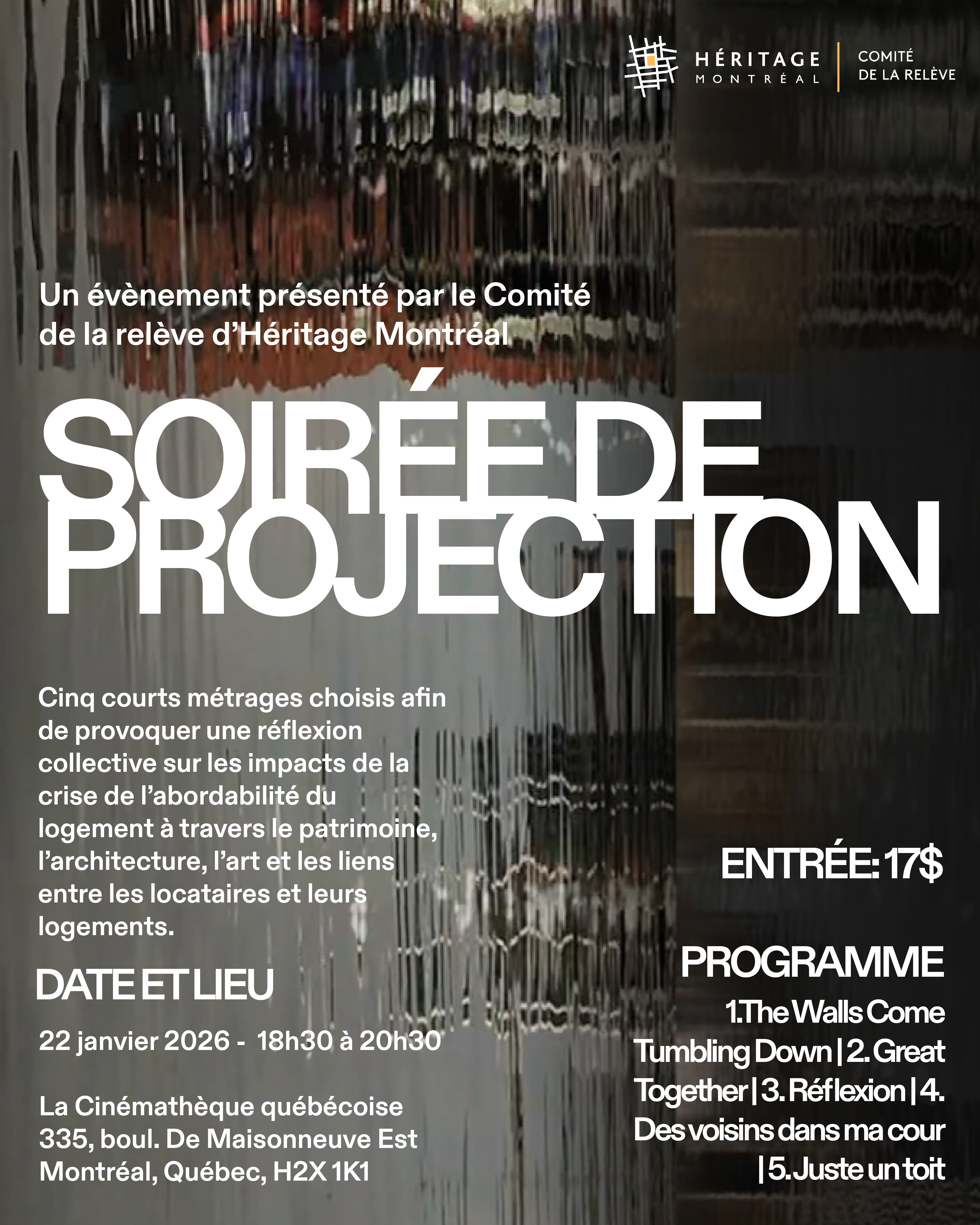 « Le Comité de la Relève d’Héritage Montréal vous invite à une soirée projection de cinq courts-métrages documentaires portant sur les liens entre logement, architecture et patrimoine à Montréal et au-delà. Nous voulons provoquer une réflexion sur la crise de l’abordabilité du logement en explorant des sujets comme le patrimoine, l’architecture, le logement social et le droit des locataires. Les cinq films révèlent comment l’architecture devient outil de pouvoir et de résistance, d’émotion et d’inspiration, autant un espace d’injustice que le terrain d’une expérience urbaine commune.