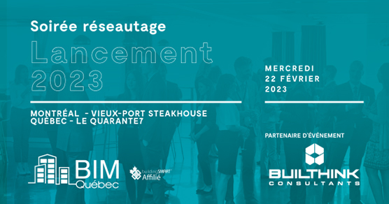 « La communauté BIM du Québec se retrouvera dans moins d’un mois, le mercredi 22 février pour la soirée réseautage « Lancement d’année 2023 ». Il sera possible de vous rendre soit à Montréal (Vieux-Port Steakhouse), soit à Québec (Le Quarante7). Nous vous attendons dès 18h, , en grand nombre, pour un cocktail à partager ensemble.