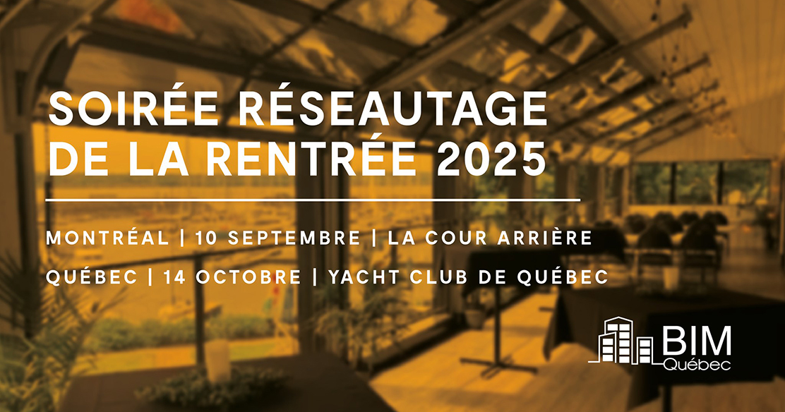 « Le Groupe BIM du Québec est fier de vous convier à son événement phare de l’automne : la soirée de réseautage de la rentrée 2025. Que vous soyez un passionné du BIM, un professionnel chevronné ou simplement curieux d’en apprendre davantage sur ce secteur en pleine évolution, cette soirée est faite pour vous !