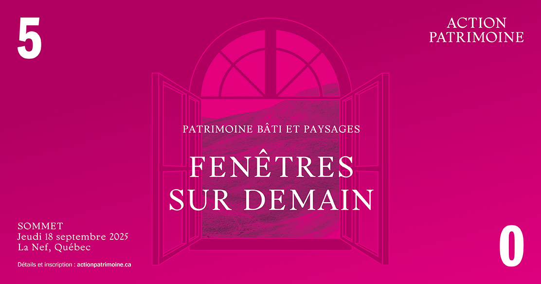 « Les inscriptions sont ouvertes pour le sommet Patrimoine bâti et paysages, fenêtres sur demain. Inscrivez-vous dès maintenant pour ne pas manquer cet événement incontournable consacré à l’avenir de notre patrimoine bâti et de nos paysages culturels.