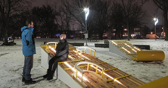 « Plusieurs initiatives ont été mises de l’avant afin de favoriser l’achat local, attirer les consommateurs sur les rues commerciales et égayer leur expérience de magasinage. Une vingtaine d’équipes de designers et d’architectes ont mis l’épaule à la roue et aménagé pas moins de 26 stations hivernales dans 18 arrondissements pour offrir aux passants de nouvelles expériences urbaines.
