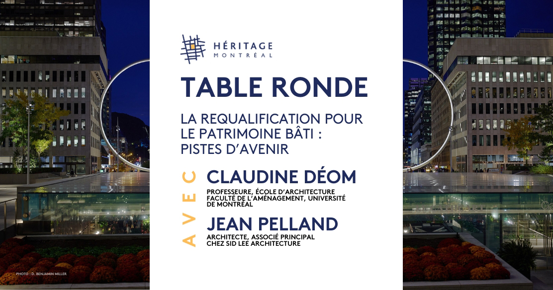 Héritage Montréal poursuit ses échanges sur le thème de la requalification comme stratégie de sauvegarde et de mise en valeur du patrimoine. Nous comptons que cette réflexion contribue notamment aux consultations prochaines sur le plan d’urbanisme et de mobilité de Montréal (PUM) et sur le plan métropolitain d’aménagement et de développement (PMAD). Après une première table ronde sur les enseignements des projets pionniers de la Maison Alcan et du Bon Pasteur puis une seconde sur les défis actuels auxquels font face les projets de requalification, la troisième explorera les pistes d’avenir. Quels seront les bâtiments ou ensembles qu’on cherchera à requalifier ? Quelle place le maintien et l’adaptation du cadre bâti existant occuperont-ils dans le développement de la métropole en 2050 ? Comment anticipons-nous les besoins futurs en termes de compétences professionnelles et entrepreneuriales pour soutenir les efforts de requalification, en développant un écosystème d’expertises et de talents adapté ? Pouvons-nous tirer des enseignements des expériences de requalification réussies précédentes pour orienter nos futures initiatives dans ce domaine ? »