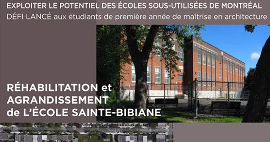 Les étudiants à la Maîtrise en architecture présentent leurs projets développés à l’automne 2016 dans le cadre de l’atelier ARC6701- Projet complet et du cours ARC6711 – Pensée constructive offerts dans le programme renouvelé de la maîtrise en architecture. Les étudiants ont travaillé sur la réhabilitation et l’agrandissement de l’École Sainte-Bibianne située dans le quartier Rosemont à Montréal.