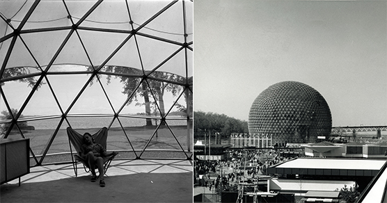 À GAUCHE: Intérieur du dôme géodésique « Skybreak » sur le bord du lac Saint-Louis, Beaurepaire, QC, été 1951. Jeffrey Lindsay/Fuller Research Foundation Canadian Division. Jeffrey Lindsay, photographe. Archives d’architecture canadienne de l’Université de Calgary. | À DROITE: Pavillon des Etats Unis, Expo 67, Montréal, 1967. R. Buckminster Fuller et Shoji Sadao. Archives d’architecture canadienne de l’Université de Calgary.