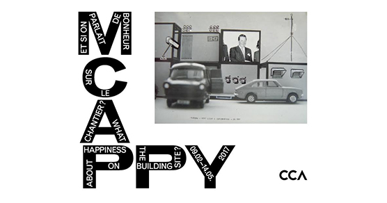 Montréal, le 2 février 2017 – Le Centre Canadien d’Architecture (CCA) présente Et si on parlait de bonheur sur le chantier? Présentée dans la salle octogonale du CCA du 9 février au 14 mai 2017, l’exposition met l’accent sur le rôle social et la responsabilité de l’architecte en repensant les pratiques traditionnelles sur le terrain et en poursuivant des stratégies pour amorcer le progrès social grâce à la recherche critique, de nouveaux outils et des approches expérimentales. Elle offre une lecture du rapport McAppy, la proposition drôle et intelligente préparée au début des années 1970 par le Britannique Cedric Price (1934–2003), un architecte, théoricien et innovateur radical. Le rapport en deux volumes, combiné à un programme d’abris portatifs (Portable Enclosures Programme – PEP), visait à améliorer les conditions de travail de sorte à assurer le bonheur et le bien-être tant physique que mental des employés, en accordant la priorité à des conditions de travail stimulantes et peu stressantes sur le chantier. »