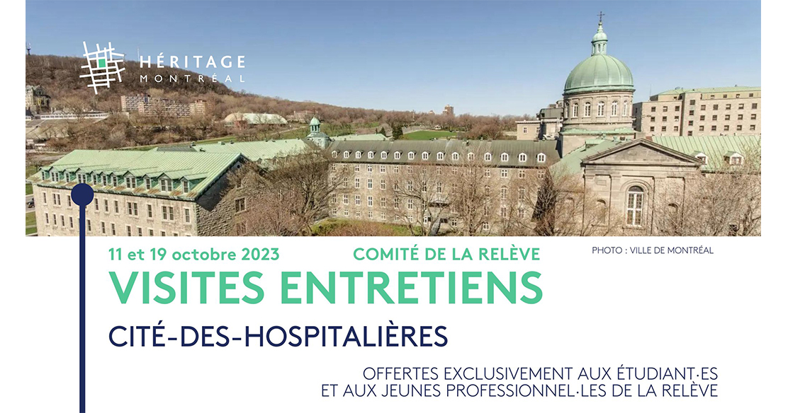 « Après la visite du 11 octobre, le Comité de la relève d’Héritage Montréal organise une deuxième visite-entretien de la Cité-des-Hospitalières le 19 octobre prochain. Ne manquez pas cette occasion unique de découvrir un ensemble patrimonial religieux exceptionnel et de comprendre le mandat d’occupation transitoire confié par la Ville de Montréal à Entremise.