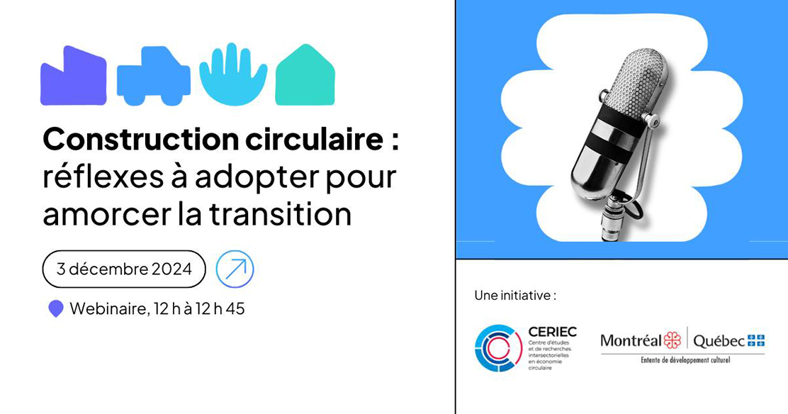 Ce webinaire propose quelques pistes de réflexion en ce sens, ainsi que la présentation de plusieurs ressources mises à disposition sur constructioncirculaire.com, réalisée grâce au soutien financier du gouvernement du Québec et de la Ville de Montréal dans le cadre de l’Entente de développement culturel de Montréal, question d’outiller les donneurs et donneuses d’ouvrage municipaux ou non, les architectes, ainsi que les ingénieurs et ingénieures. »