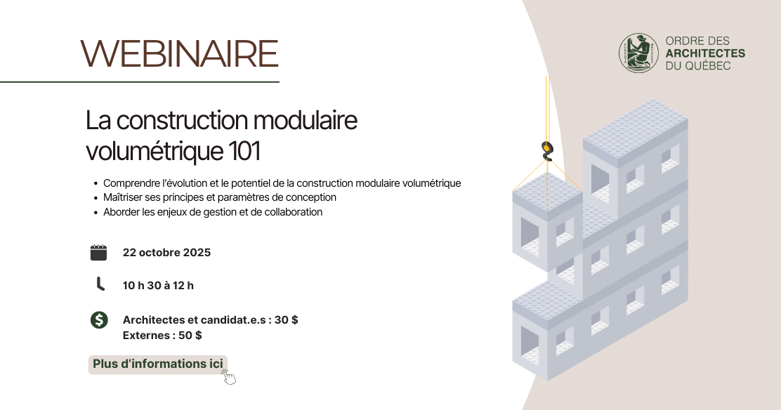 « L’Ordre invite ses membres ainsi que tous les intervenants et intervenantes de l’industrie de la construction à un webinaire essentiel sur la préfabrication architecturale intitulé : La construction modulaire volumétrique 101, une introduction aux principes, au potentiel et aux enjeux de cette approche innovante en architecture.