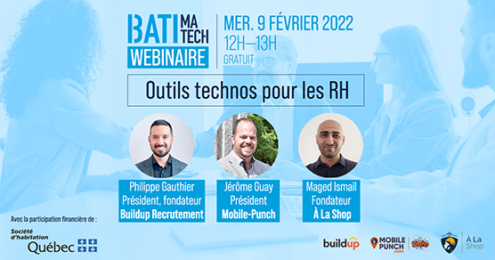 « Nous sommes heureux d’annoncer le premier webinaire de Batimatech de l’année. Il aura lieu le mercredi 9 février prochain de 12h à 13h et traitera des outils technologiques pour relever les défis RH en construction.