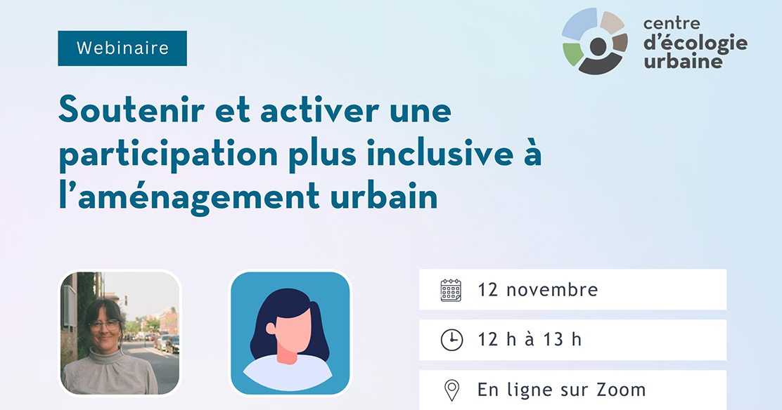Le 12 novembre, de 12 h à 13 h, le Centre d’écologie urbaine et la TGFM invitent les professionnel·les, organismes et citoyen·nes au webinaire « Soutenir et activer une participation plus inclusive à l’aménagement urbain ».