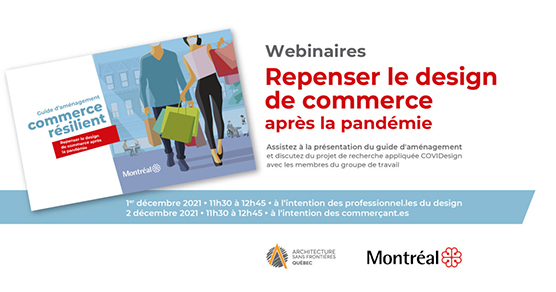 « Les 1 et 2 décembre prochains, tous les acteurs des milieux du commerce et du design sont invités à l’un des webinaires pour découvrir le nouveau guide d’aménagement Commerce résilient : repenser le design de commerce après la pandémie. En effet, comment tirer les leçons de la pandémie pour augmenter la capacité de résilience économique et sanitaire des espaces commerciaux? Comment adapter leurs parcours-client et leurs modèles d’affaires à la nouvelle normalité de l’ère post-COVID ? Et, pour ce faire, quelles adaptations et innovations s’imposent en matière de design ? Voilà des questions auxquelles ce Guide et ce webinaire apporteront des réponses.