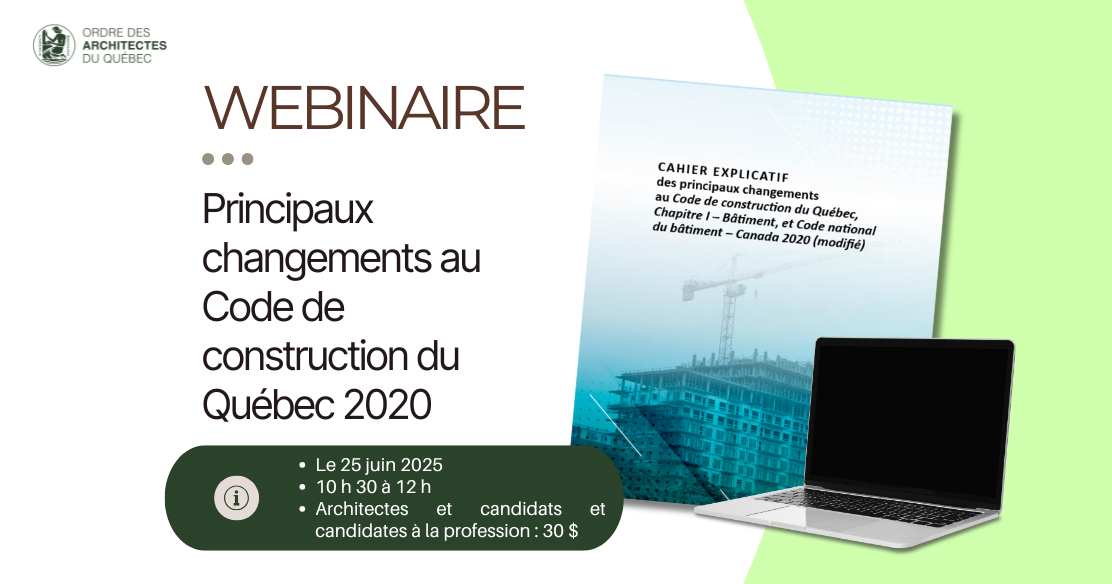 « L’Ordre invite ses membres et tous les intervenants et intervenantes de l’industrie de la construction à un webinaire essentiel pour rester à jour sur les principaux changements apportés au Code de construction du Québec 2020.
