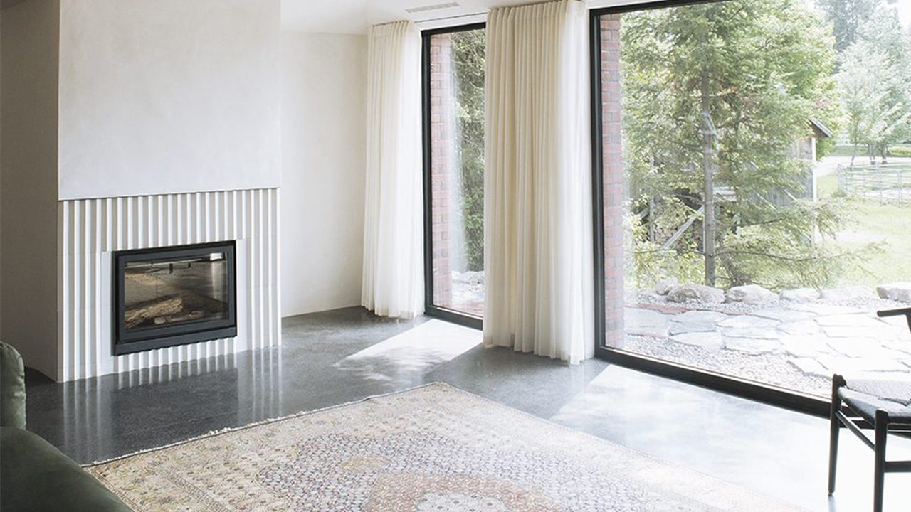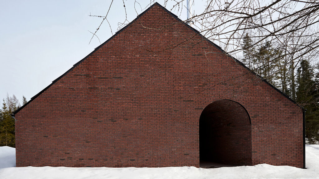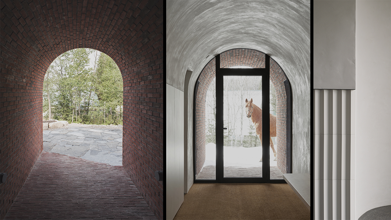 La diversité des espaces intérieurs contraste avec l’apparente simplicité du volume extérieur. La toiture massive s’assoit sur le socle en brique de 7 pi. Leur lecture géométrique rentre en dialogue avec l’imposant corps de ferme existant, tout en assumant leur empreinte dans une nature omniprésente.