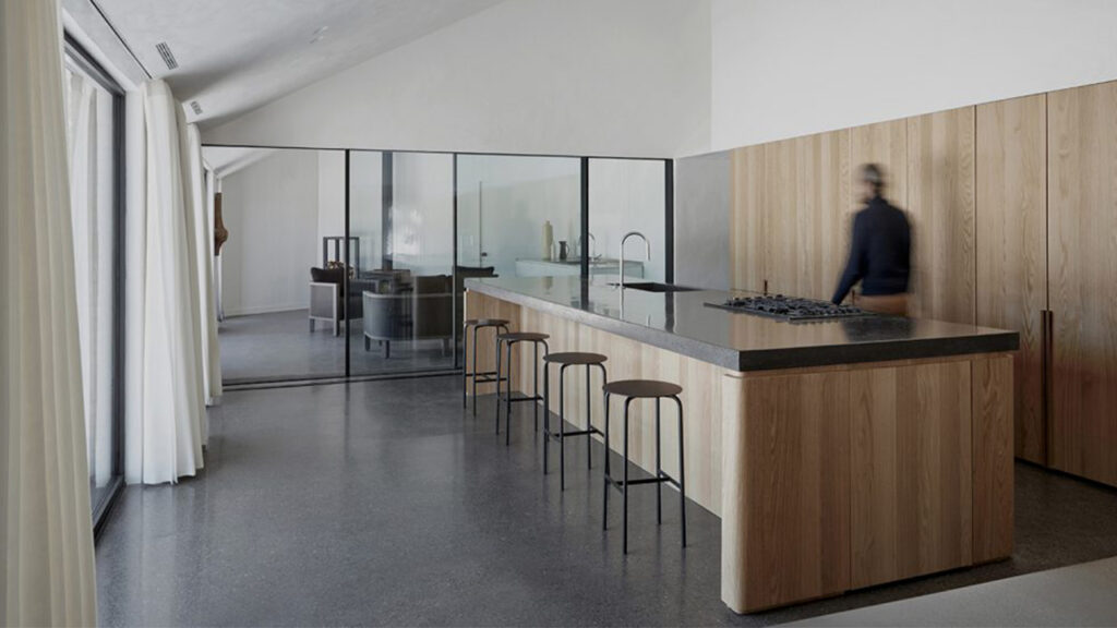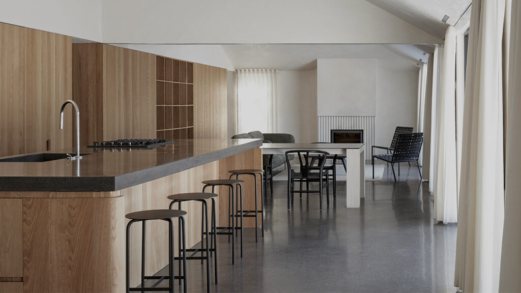 Dans celui-ci, les hauts plafonds inclinés sont divisés par deux lames verticales qui partitionnent cuisine, salle à manger et salon sans jamais cloisonner le volume. Le gazebo est une prolongation fluide de l’intérieur vers l’extérieur.