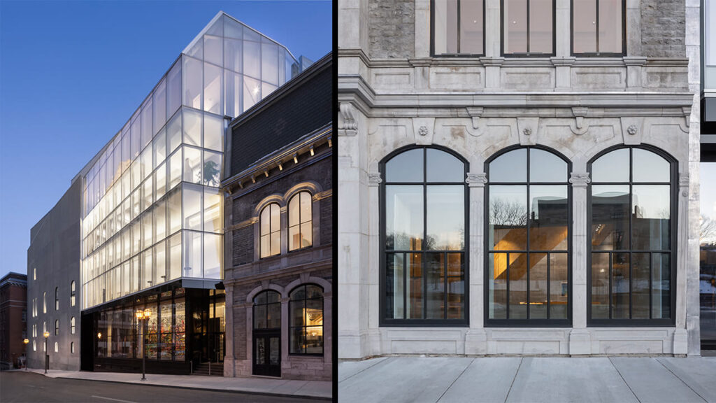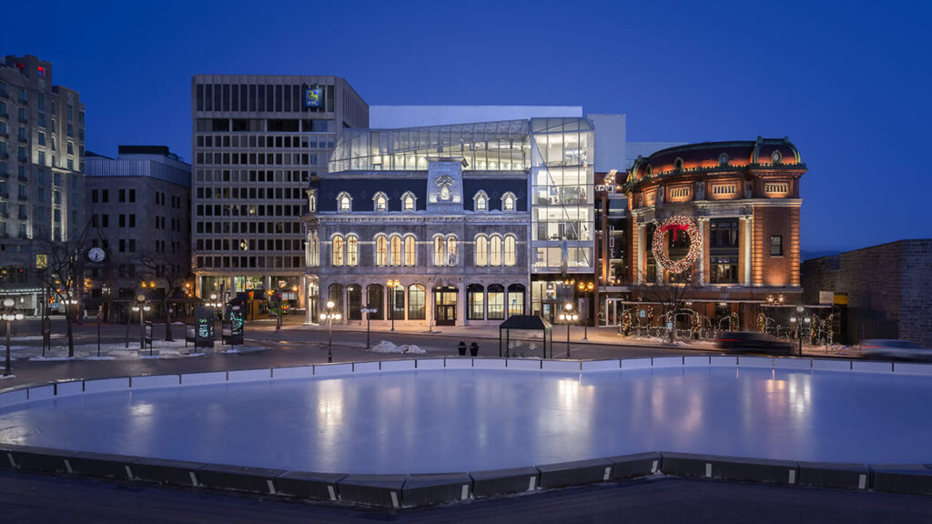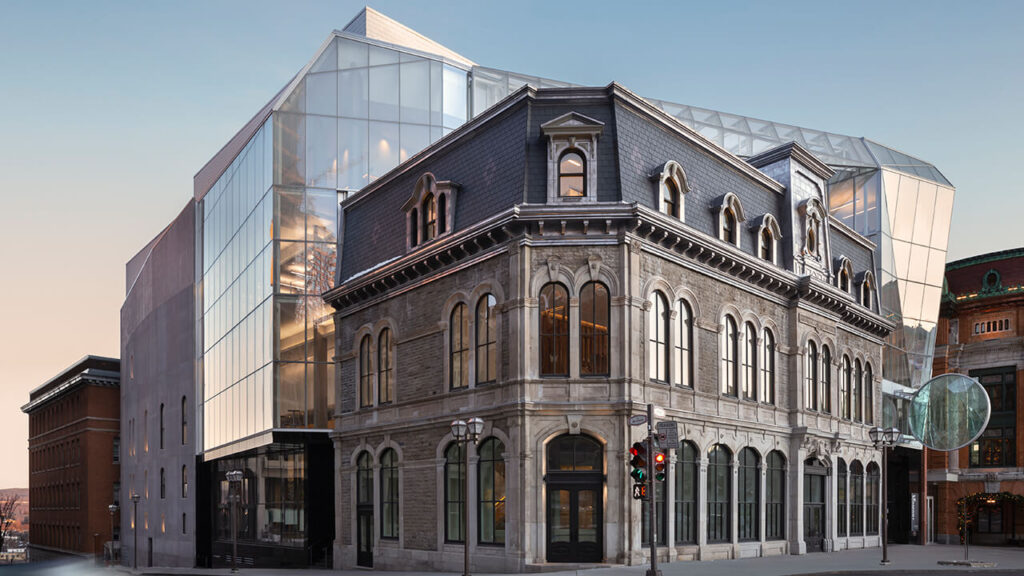 Le volume de verre sérigraphié s’inscrit entre l’ancien bâtiment du YMCA aux façades de pierre et la nouvelle salle surmontée d’un studio de création. Restaurées à l’authentique, les façades de l’ancien YMCA, réanimées par leur nouvelle vocation, contribueront à redynamiser la place publique et la rue. La volumétrie de la toiture mansardée est reconstituée telle qu’à l’origine avec son revêtement en tuiles d’ardoise et de cuivre étamé. Le studio de création qui émerge derrière le volume de verre en toiture est recouvert de bardeaux d’acier inoxydable et s’efface contre le ciel.