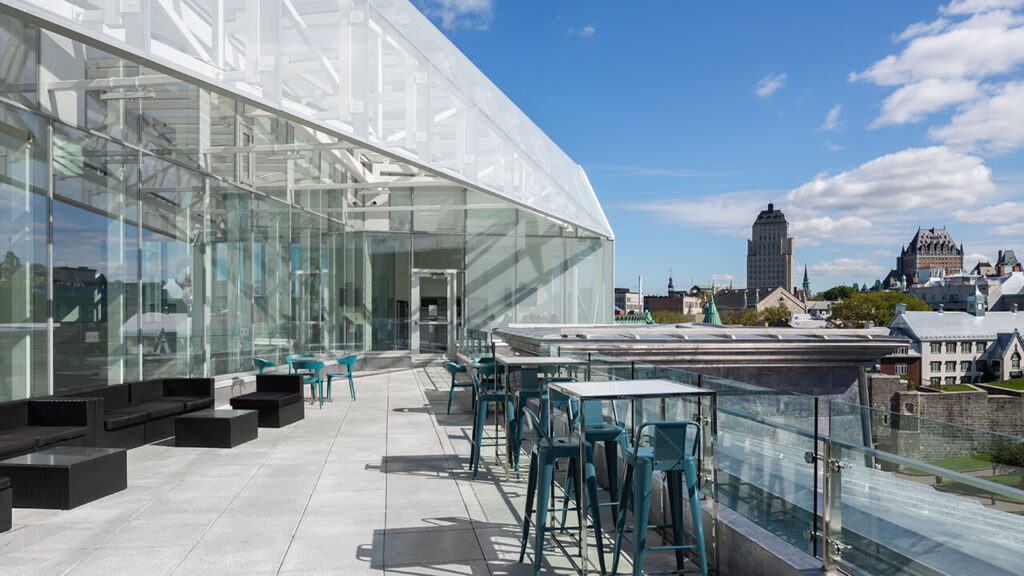 Au sommet de cette brèche émerge un volume de verre en fond de scène de l’ancien YMCA. Le volume de verre facetté, traité en transparence et en translucidité, signale le nouveau lieu culturel et agit comme atrium en son cœur et lanterne urbaine le soir venu. Faisant le pont entre les deux parties de la place d’Youville, le prisme cristallin affirme les deux entrées qui mènent au centre du projet.