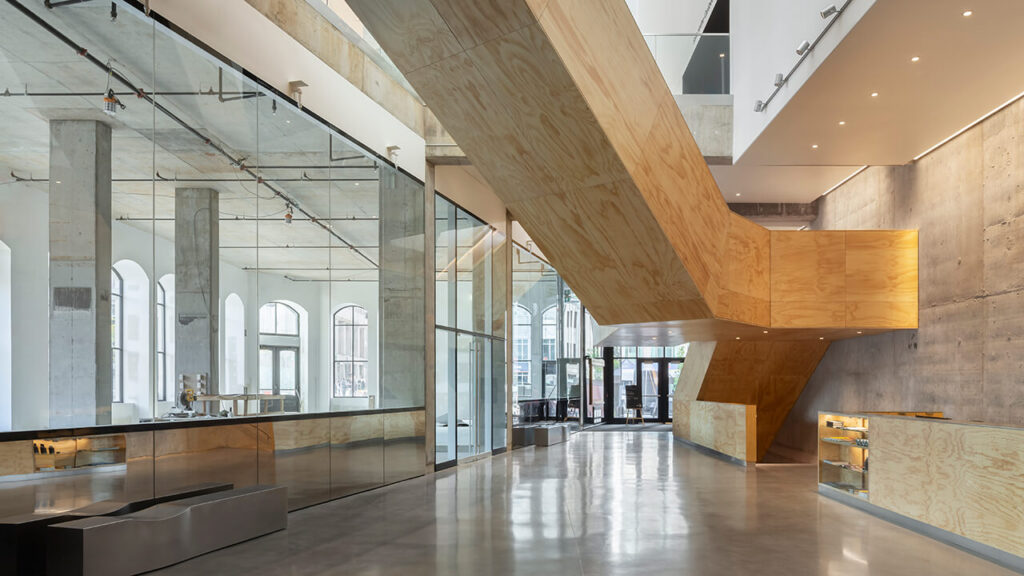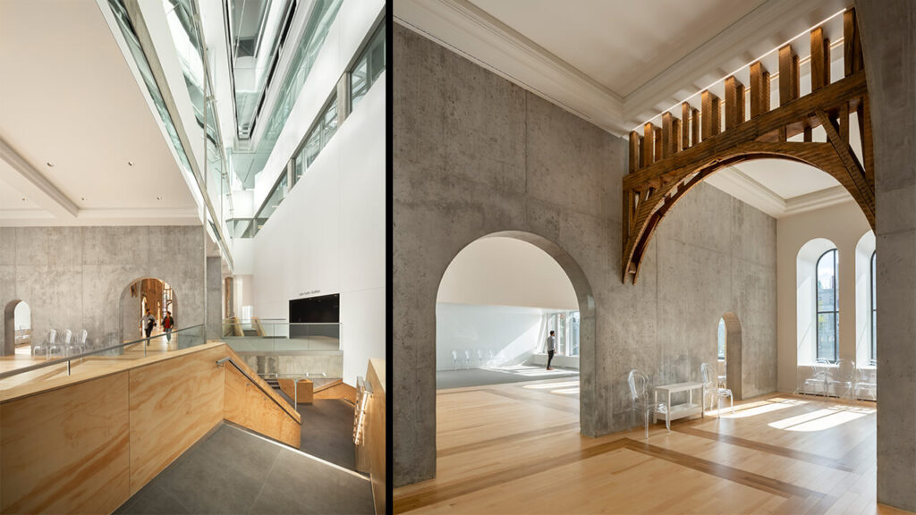 La sensibilité apportée par l’équipe d’architectes à la mise en valeur contrastante de certains éléments de l’ancien bâtiment (par exemple, dans le foyer) tout en mettant en scène des interventions monumentales, comme l’escalier sculptural, est inspirante.