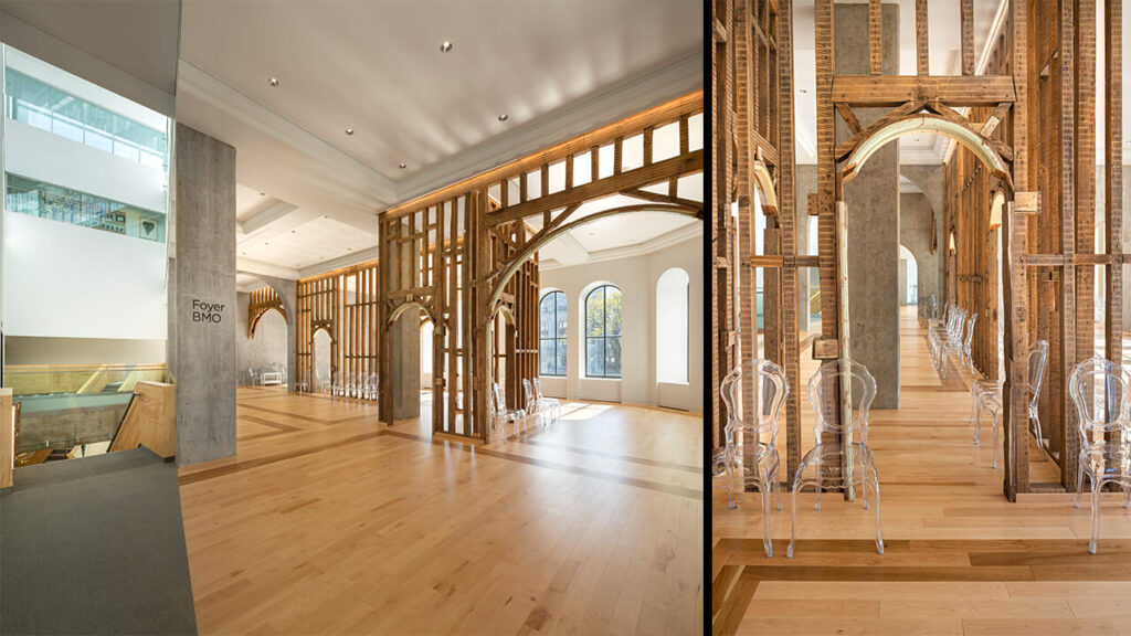 Quant à la salle de spectacle, sa sobriété parée de façades latérales en bois gravé aux teintes noires qui rappellent autant un décor d’avant-scène que le style architectural de l’ancien YMCA, permet d’attirer l’attention des spectateurs sur la raison même du projet, soit la scène de théâtre.
